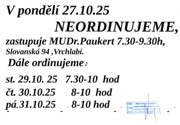 - AKTUÁLNÍ INFORMACE OHLEDNĚ ZMĚNY PRACOVNÍ DOBY, DOVOLENÉ ... ZDE, nebo v záložce Aktuálně z ordinace ... .